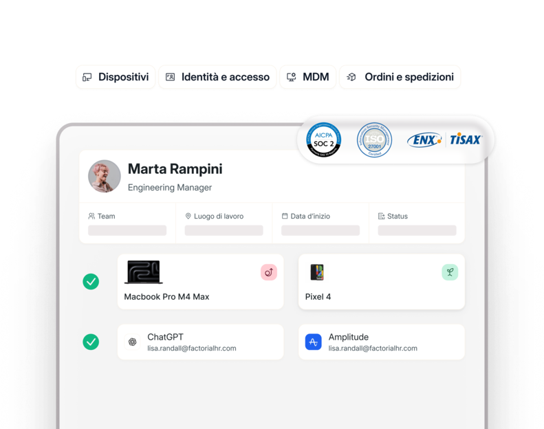 Sì. Factorial IT è un software moderno di gestione degli asset aziendali che rispetta gli standard SOC 2 e applica controlli di sicurezza come crittografia, blocco e cancellazione dei dati da remoto, archiviazione degli audit e applicazione conforme delle policy su dispositivi e strumenti SaaS.